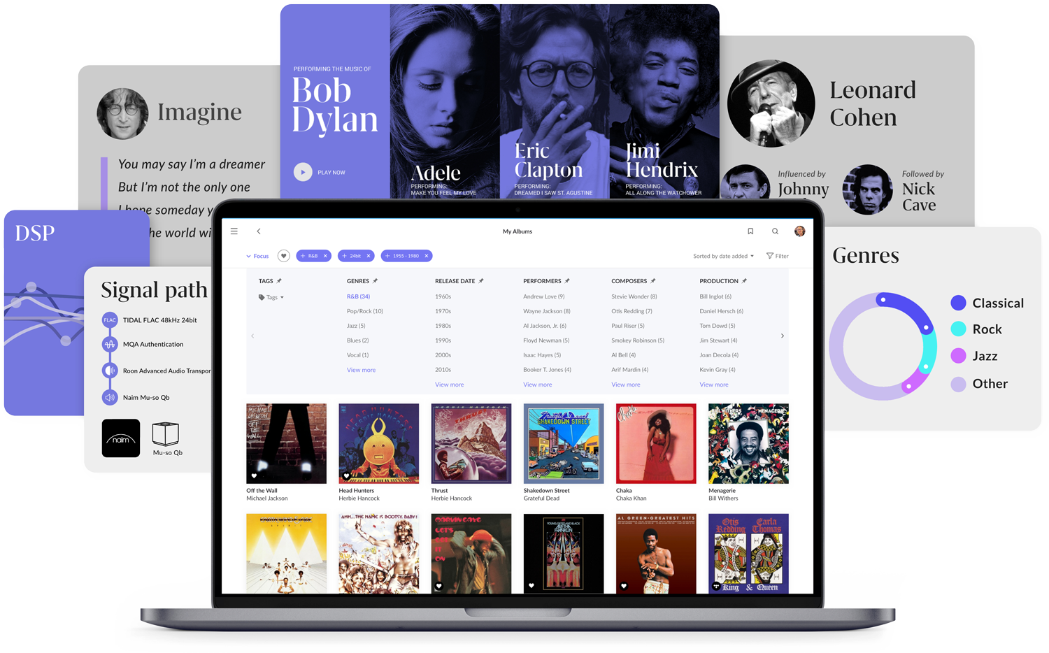 Effortlessly browse, discover and play music from the Roon app, available for iOS, Android, Mac and Windows. The Roon app transforms your music into a thrilling journey of new-world exploration, offering rich insight, understanding and appreciation of songs, artists, genres and more.