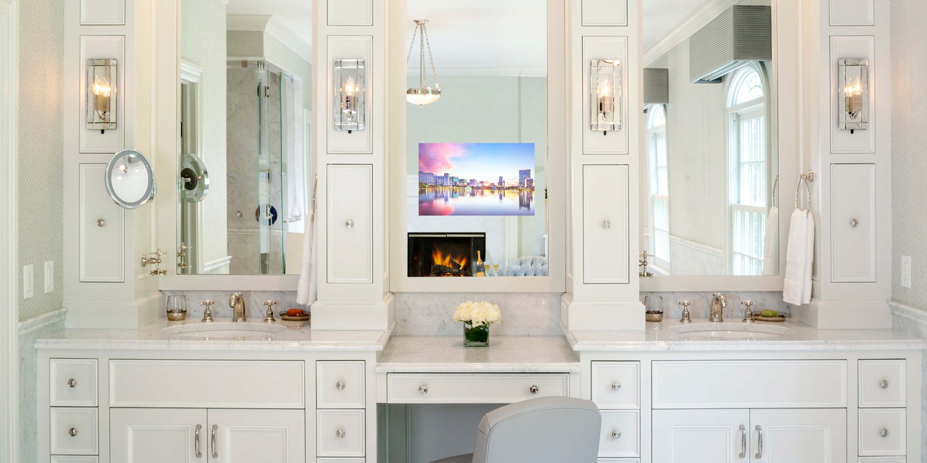 Set the perfect ambiance for relaxing in the tub by candlelight or getting ready for work with one-touch customizable scenes that brighten and dim lights on command.